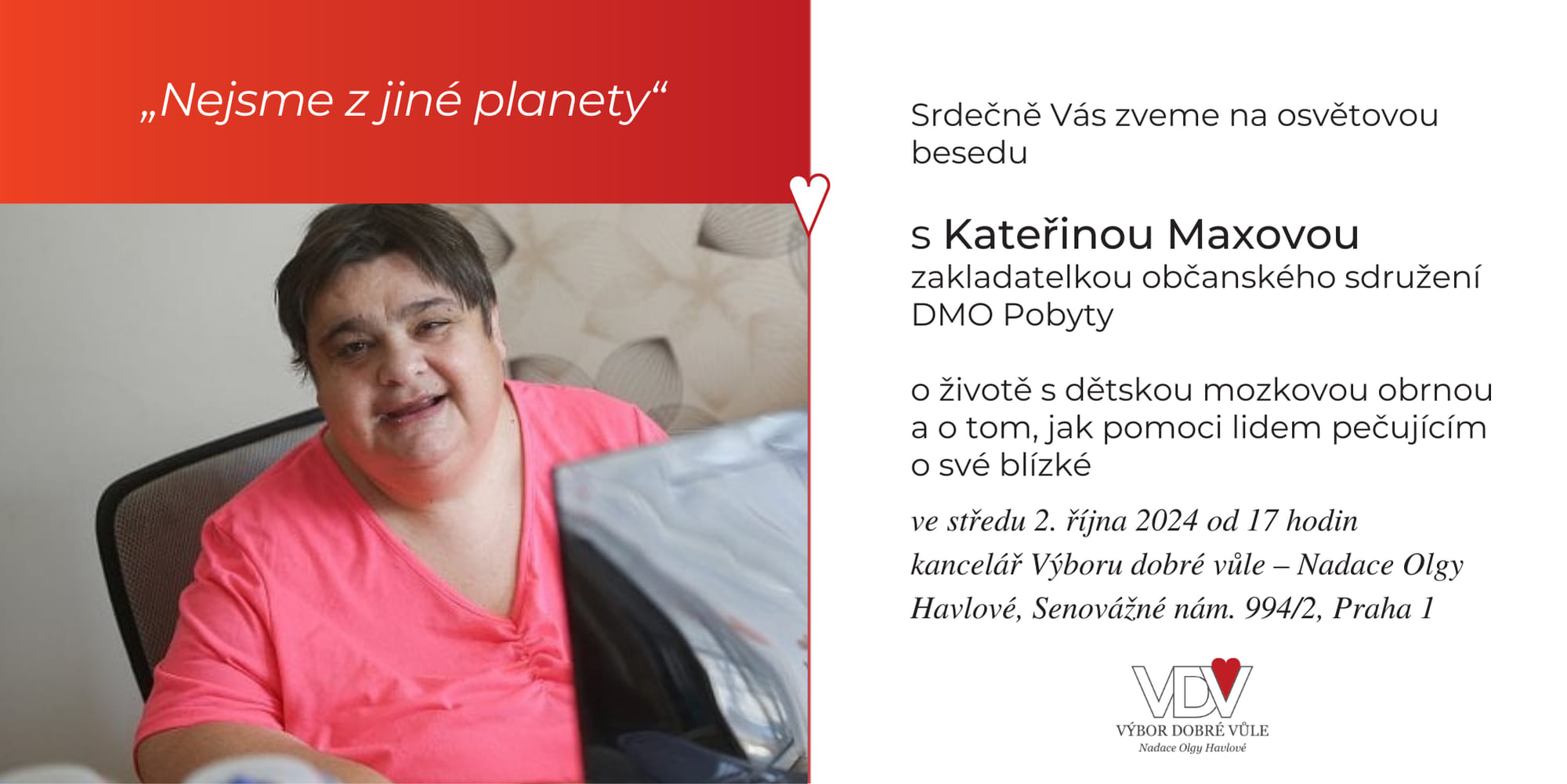 Srdečně zvu na další osvětovou a besedu „Nejsme z jiné planety“, tentokrát v prostorách Výboru dobré vůle – Nadace Olgy Havlové, Senovážné nám. 994/2, Praha 1.